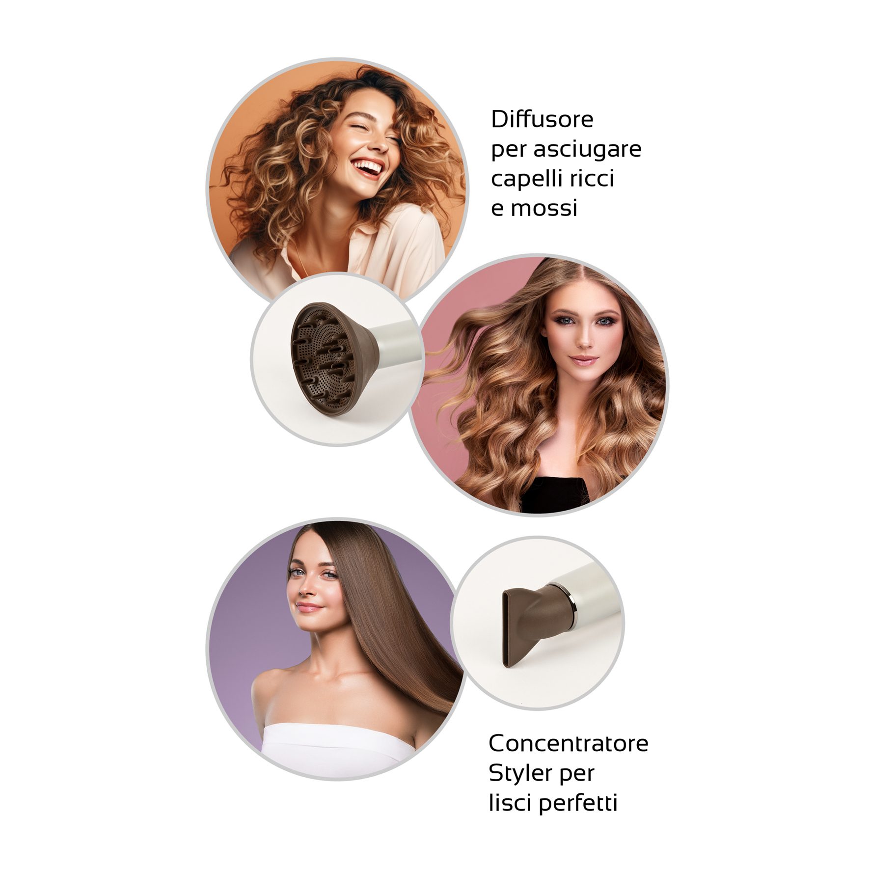 Stupenda è l’asciugacapelli dotato di tecnologie innovative come il motore BLDC di ultima generazione, in grado di generare un flusso d’aria ad alta potenza e velocità, per un’asciugatura più veloce e uno styling più duraturo. La tecnologia ionica protegge il capello e sterilizza la cute, e grazie agli ioni negativi migliora la morbidezza e la brillantezza dei capelli mentre riduce secchezza ed effetto crespo. Le 15 possibili combinazioni d’uso calore/velocità permettono di scegliere il tipo di asciugatura: delicata per diffusione su capelli ricci, regolare per non danneggiare il capello, rapida per uno styling perfetto. Il controllo intelligente tramite sensore ed elettronica mantiene la temperatura perfettamente costante durante tutta l’asciugatura e la funzione di caldo e freddo ciclico riduce lo stress del capello. Stupenda include il diffusore per capelli ricci e mossi e il concentratore Styler per lisci perfetti. Leggero e compatto, è ecologico perché richiede una minore quantità di plastica per la costruzione.