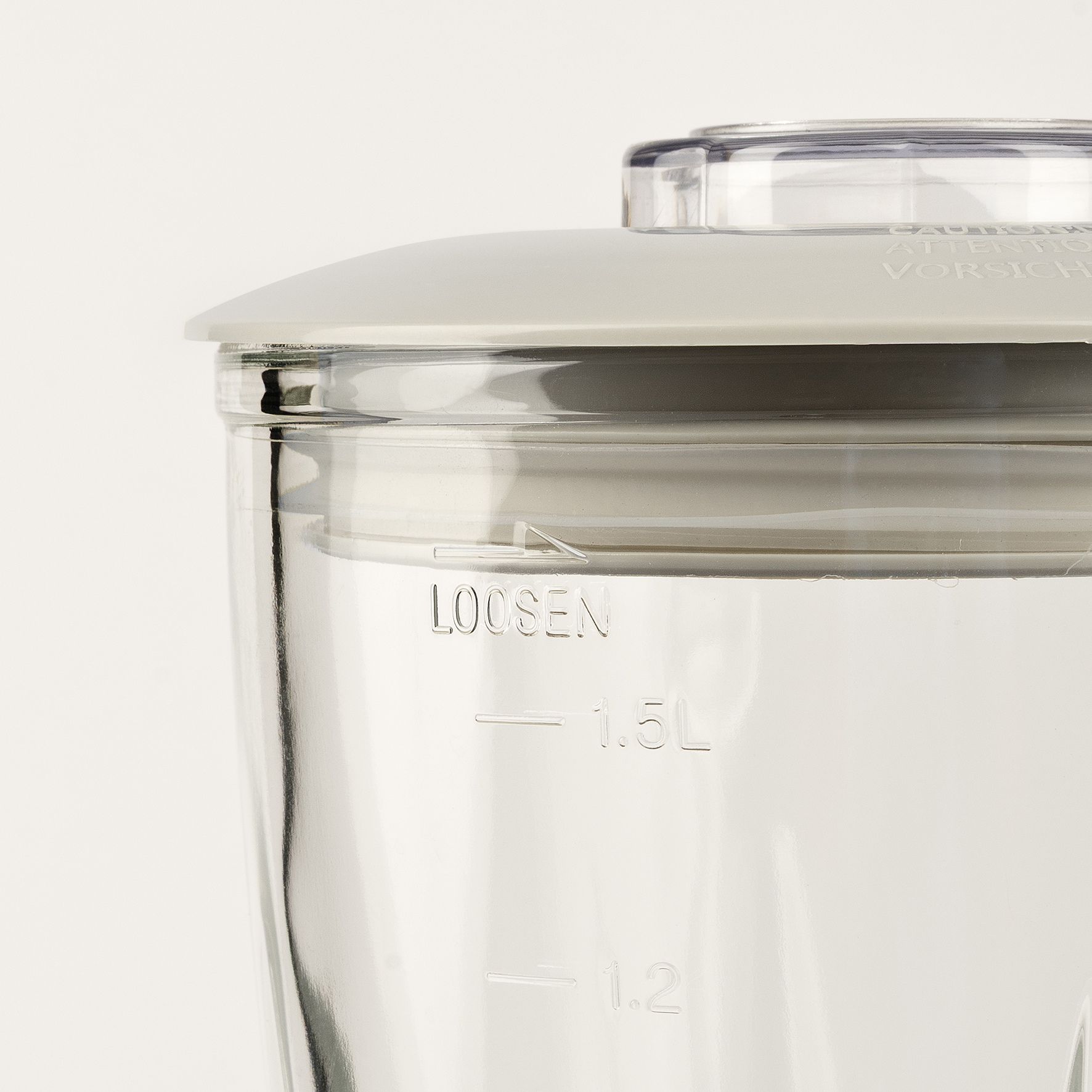 Its elegant design and 1.5 L capacity make it ideal for processing large quantities of food. The graduated glass jar is equipped with a sealed lid to prevent spillage during processing and ensure safety during use. Thanks to its six blades, it can even crush ice.