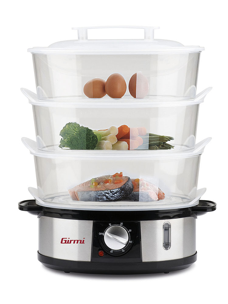 Con la vaporiera elettrica Girmi VP26 puoi preparare più portate contemporaneamente grazie ai tre livelli da 4 litri ciascuno. Verdure, cereali, carne, pesce o uova: tutto cuoce senza condimenti aggiunti, mantenendo intatti vitamine e minerali.